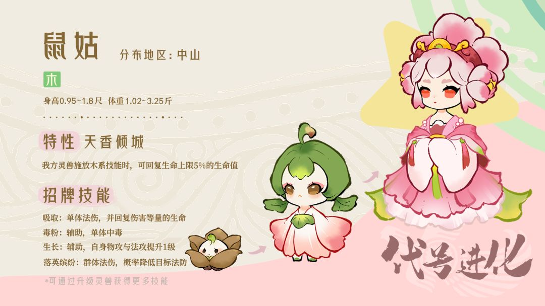 一阶进化后的鼠姑成长为漂亮少女的模样,头顶的绿色花梗变成了发髻,宛如一个小草帽。身穿以牡丹花瓣为灵感制作的粉绿色花瓣裙,显得充满灵动与优雅。拥有中等的自然治愈能力,能有效治疗轻度和中度的创伤。可以控制植物的生长,利用藤蔓和植物根须为自己搭建保护屏障,或攻击敌人。