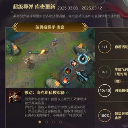 同时,截止至3月12日,召唤师完成“超级导弹 库奇更新”活动任务,即可获得龙魂水晶*500奖励!