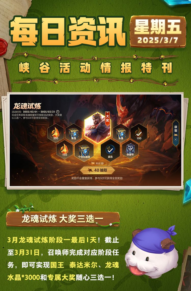 春意融融 峡谷同游峡谷同游赢好礼!3月8日(明日)10:00至3月14日23:59,召唤师完成任务即可获得森光凝粹*450、传奇图集三星卡包(蓝)、传奇图集二星卡包(绿)与龙魂水晶*200好礼~