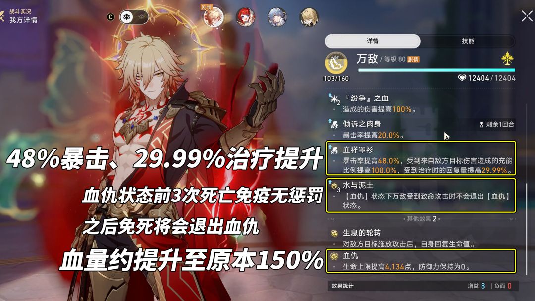作为3.X版本主C,万敌同样拥有非常离谱的自拐增益:48%暴击率、受治疗提高29.99%、【血仇】状态血量约提升至原本150%(剧情中8269变成12404)。