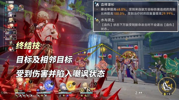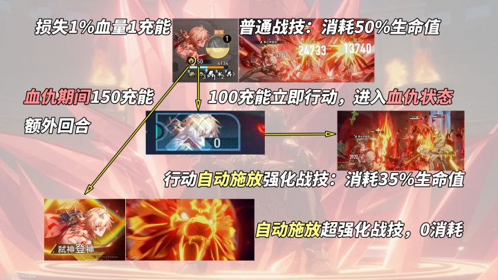 【血仇】状态防御降为0、终结技造成扩散伤害并嘲讽受击目标、受击充能比例提高100%、前3次死亡直接复活(3次后则是退出血仇代替死亡)。