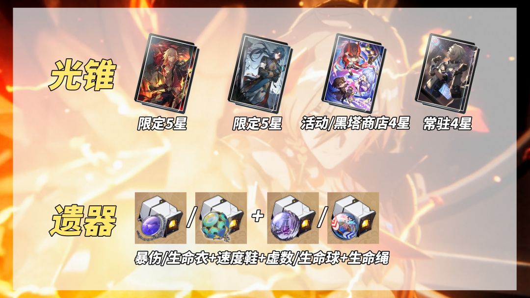 光锥主要考虑暴击伤害、生命值、增伤、减防、易伤这几种情况,如以下光锥:万敌同期限5「血火啊,燃烧前路」、刃同期限5「到不了的彼岸」、活动/黑塔商店4星光锥「忍事录•音律狩猎」、4星「秘密誓心」。