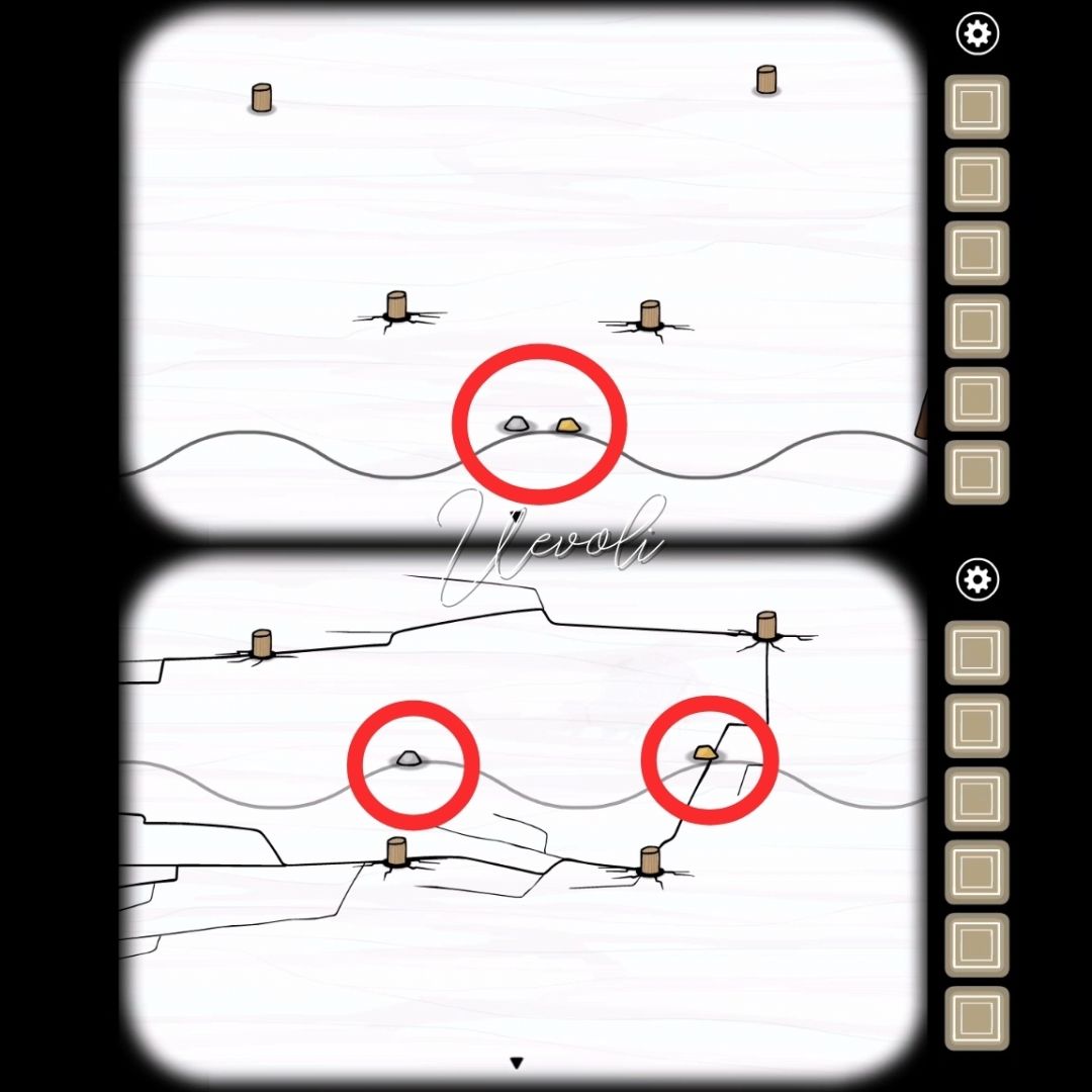 「破除冰封」◆进入场景后右滑点击妹妹,开始解谜(将石子分别放在下图位置,等待妹妹滑过):