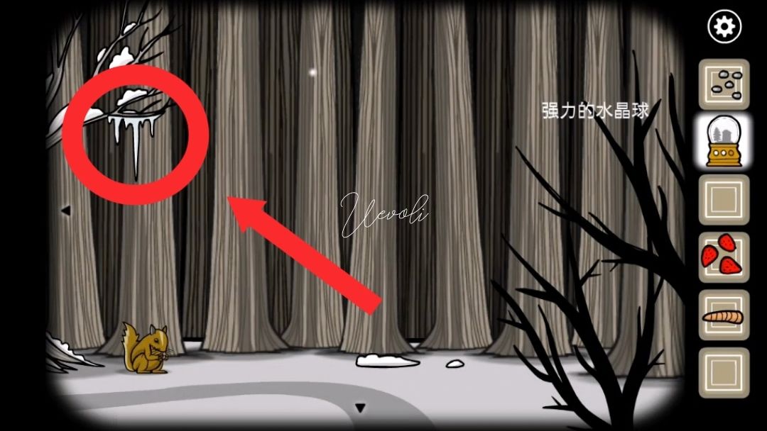 ◆回退场景后点击松鼠正上方的冰锥,将它点碎。