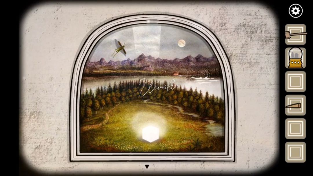 ◆点击上方悬挂的金色盒子,打开后把[黑方块]放进去,画面闪光,点击图画上的白色方块。