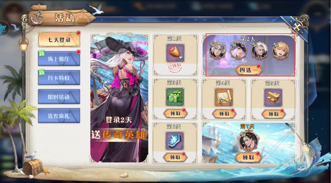 4.七天登录奖励:第二天送的英雄先别着急选,对比下你手上的英雄,如果你是缺前排再选前排,如果不缺英雄就开对应的英雄碎片或者羁绊英雄,免得浪费了英雄碎片