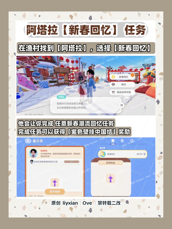 在渔村找到【阿塔拉】,选择【新春回忆】,他会让你完成任意新春潮流回忆任务。