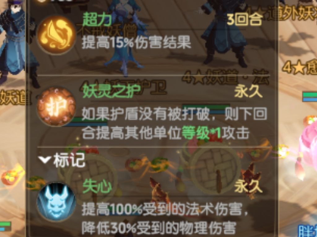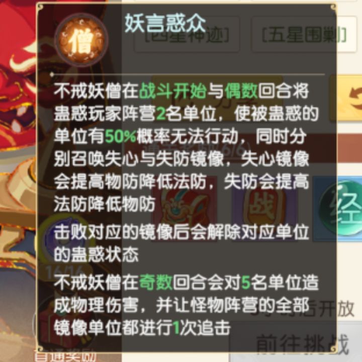 1、首回合及双数回合,不戒妖僧会蛊惑两名己方角色/器灵被蛊惑的己方阵容会被附加蛊惑,(有百分之五十概率出手失败)并复制失心两名己方角色。加入怪物阵容中,