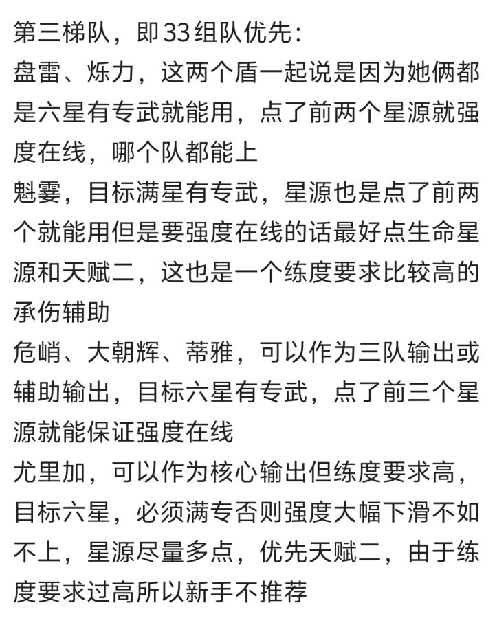 由于taptap发帖字数限制,具体战员培养攻略(同一梯队战员培养顺序不分先后),11队伍配队及思路,33队伍配队、思路及注意事项请看图片。