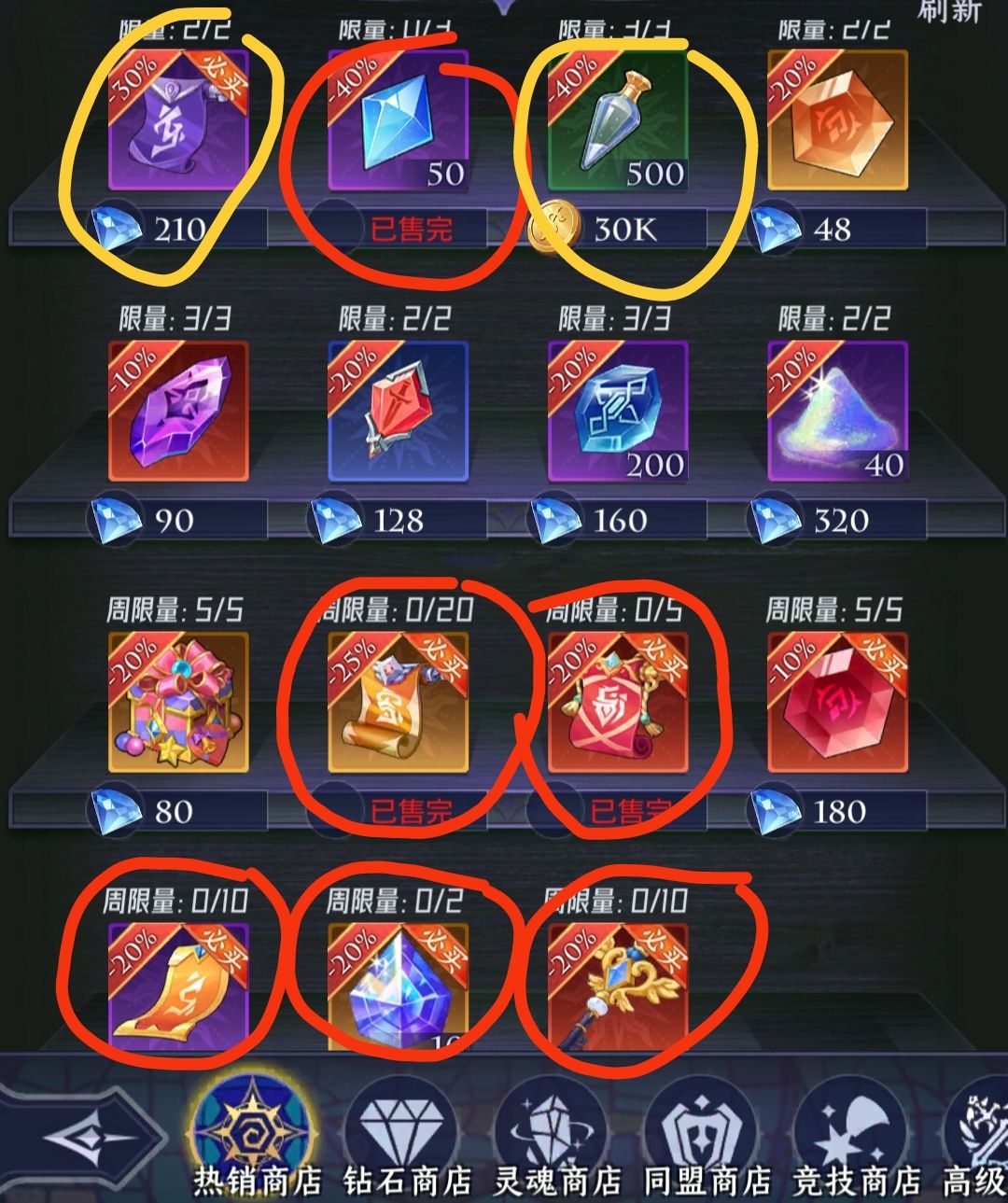 高级商店只买白票,竞技场商店只买美杜莎,荣耀商店先买奥丁,满了买黑石头,深渊商店只买神器箱。
