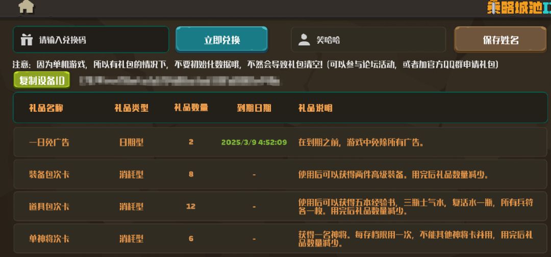 道具包次卡:使用后可以获得五本经验书,三瓶士气水,复活水一瓶,所有兵符各一枚。用完后礼品数量减少。