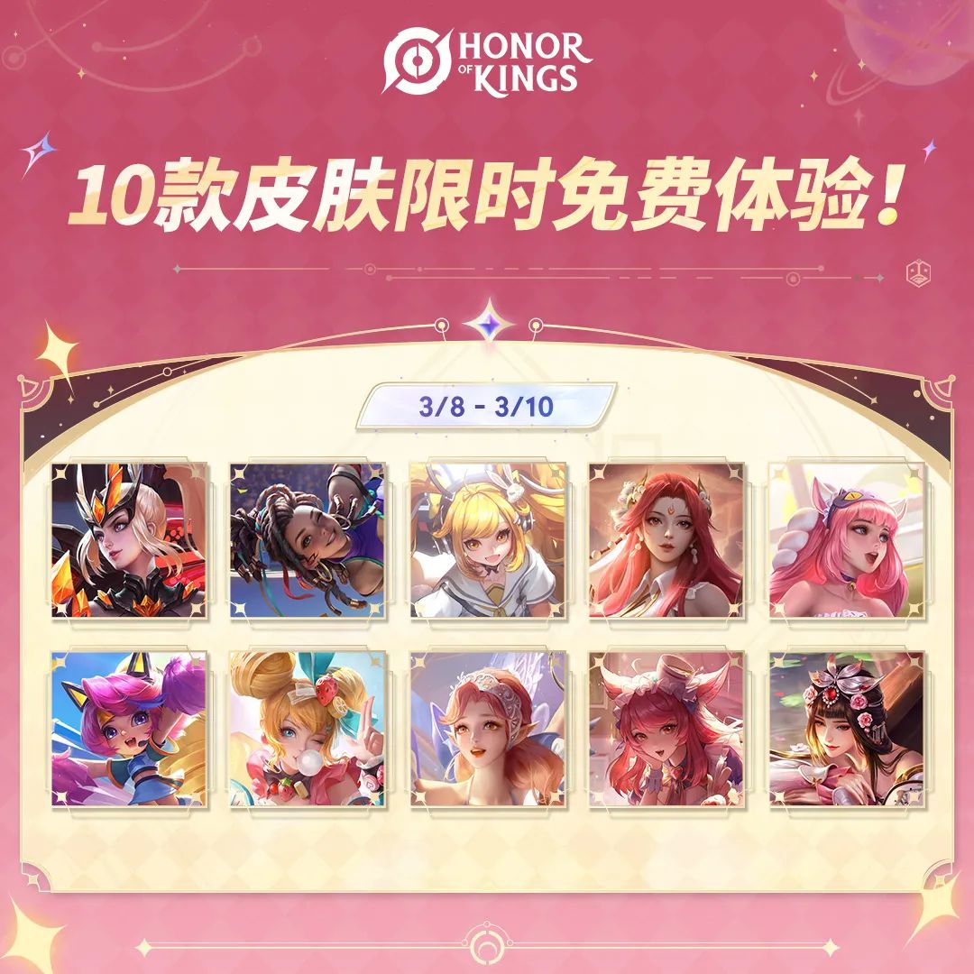 这还不算完,今天是女神节,王者也是推出了限免奖励,3月8日 - 3月10日共10款造型限时免费体验!
