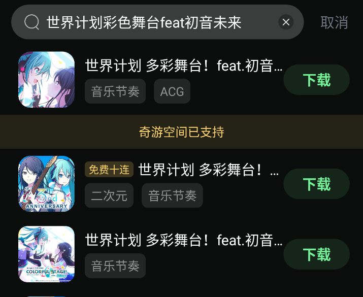 第二步:奇游内搜索【世界计划 多彩舞台】,点击下载即可安装游戏(日服、繁中服、国际服都可以下载!!!)