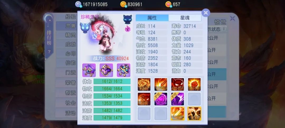 星魂属性方面选择的是以气血和物攻为主!同时还掺杂了一点速度!当然这三条属性对于一个物理宠物来说都是比较合适的属性,不知道大家有没有发现它的物防也有着70多的属性,说实在话这个真的就是没啥用了,建议洗一洗搞成物攻或者是速度就更好了!