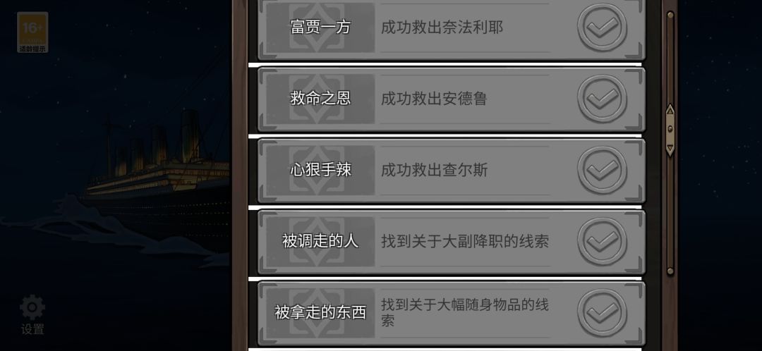 努力n小时,所有成就都达到了,尤其是与死神赛跑(先把所有准备工作做好,谁都是差一步就能获救,然后先救杰克打开头等舱,再救三等舱的母子不然等会淹死了,最后救其他人)和无人生还(见到一个救一个,但是都不送去夹板)。但是呢?为什么每次我都要待在船上等死啊?扎克(厨师)不是说想办法给我留个座位吗?我请问呢?位子呢?