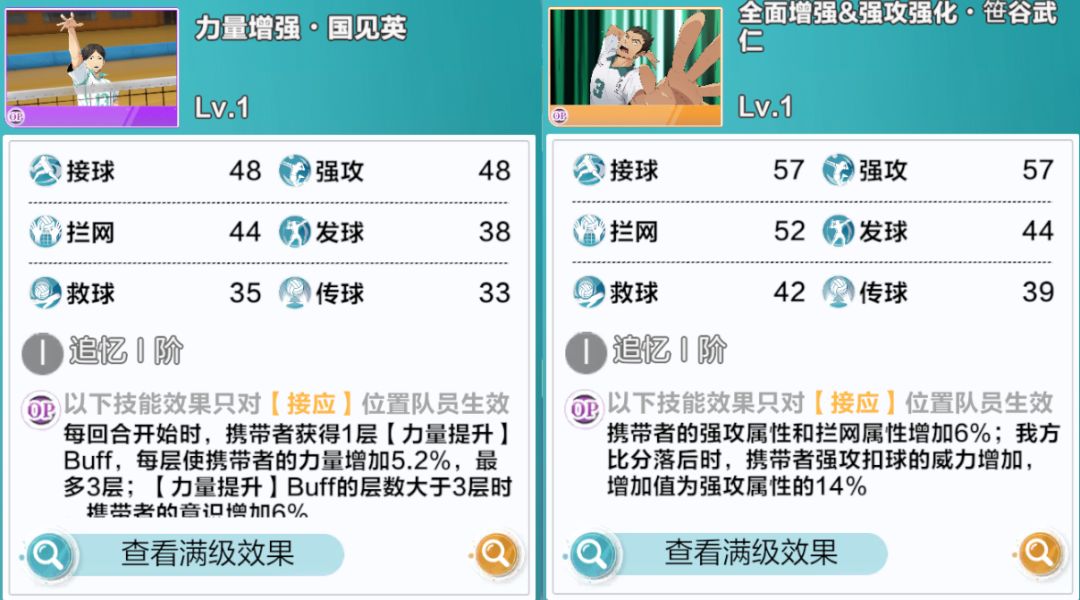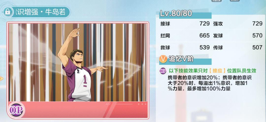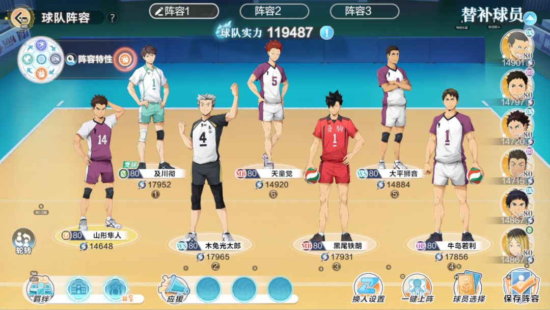 其次,在及川上线后,需要用到及川发球的队伍,因为游戏里的站位问题,OP位如果选择大地、木叶这类接球型OP,站位会很不舒服,所以进攻型OP对阵型保持也是很不错的选择。