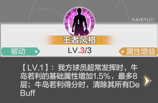 我方球员超常发挥时,牛岛的基础属性叠层增加。牛岛得分时,清除自身DEBUFF。