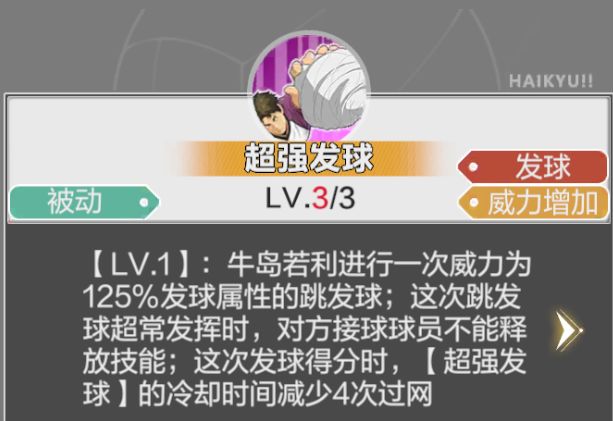 【解析】此技能原本的CD是6次,如果发球得分,CD减为2次。比较可惜的是,发球技升级也不能多减CD,发球得分不能直接刷新CD。在及川登场前是很厉害的发球技,不过有了及川或者未来的宫侑后,牛岛能发球的机会就少很多了。
