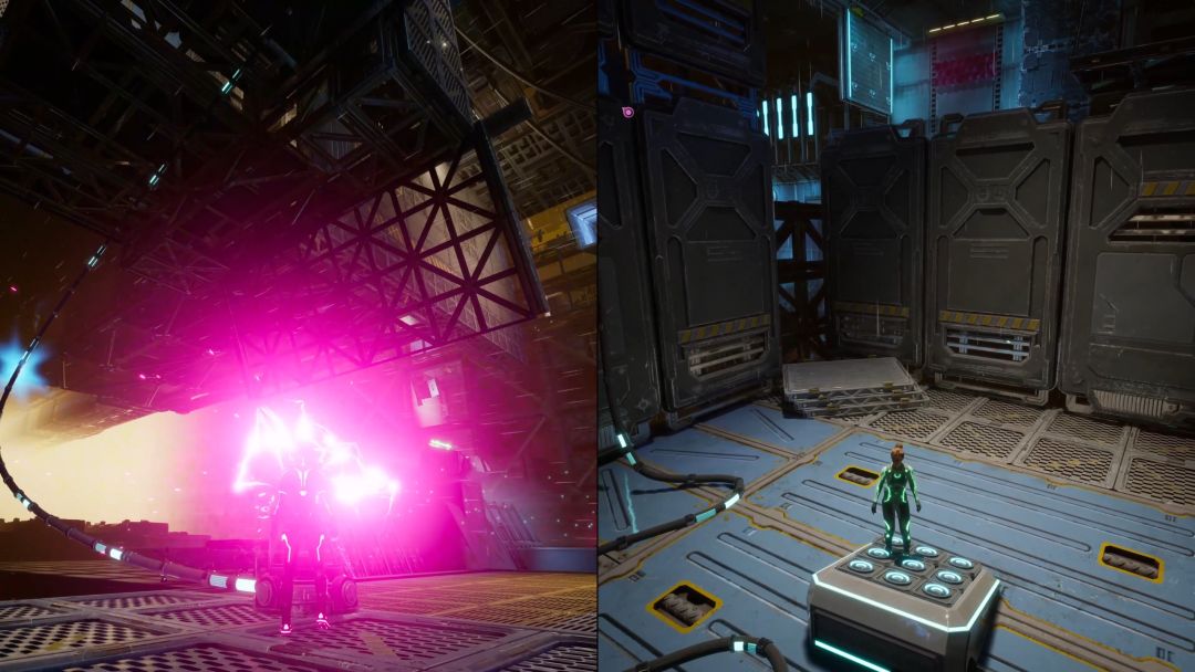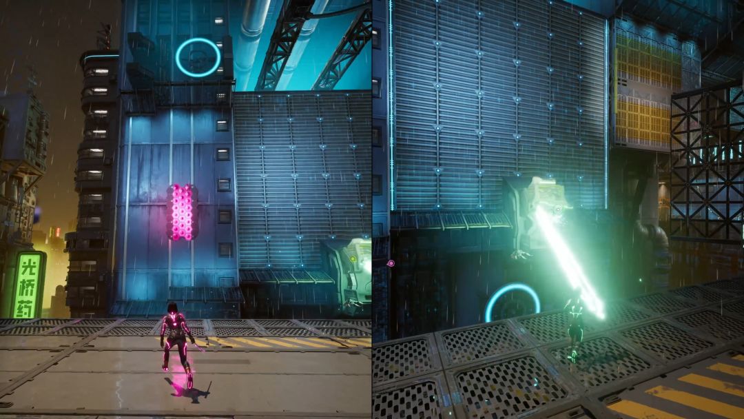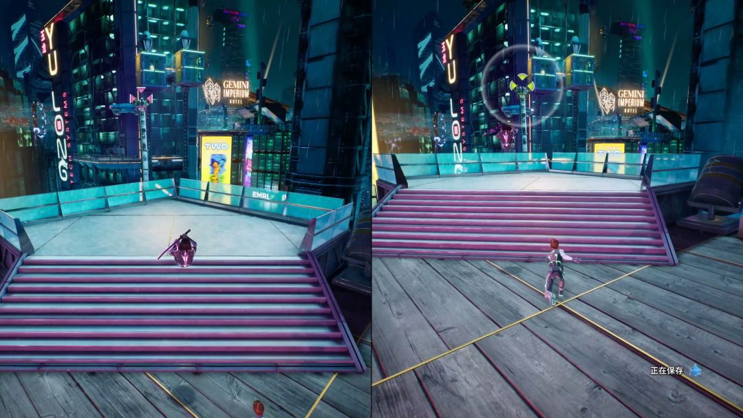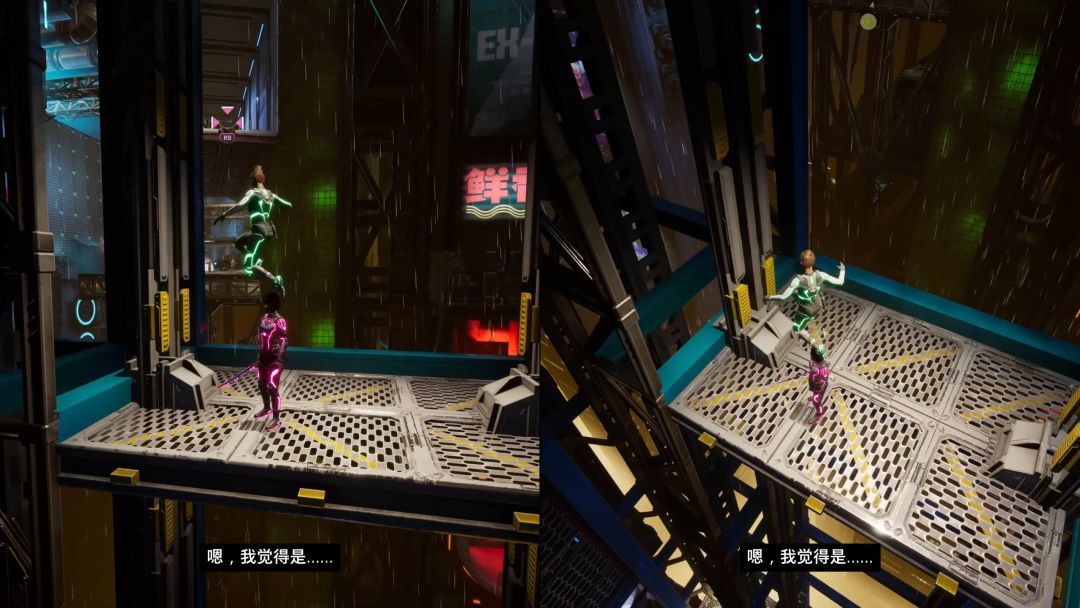 这里由于小粉重力视角问题,小粉先负责去绿色柱子这里帮助小绿将最右侧柱子打开