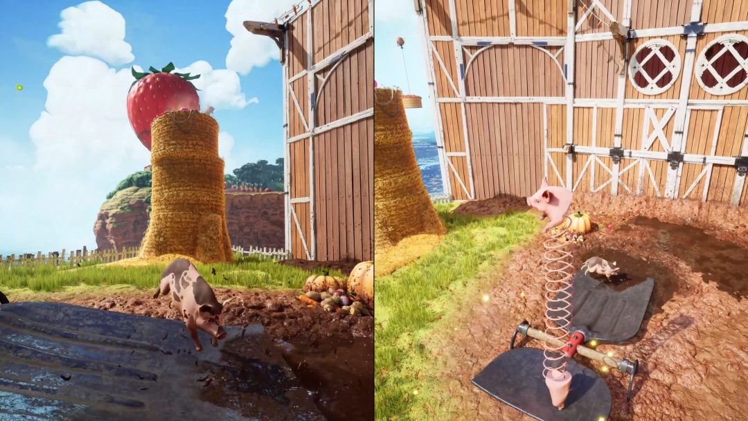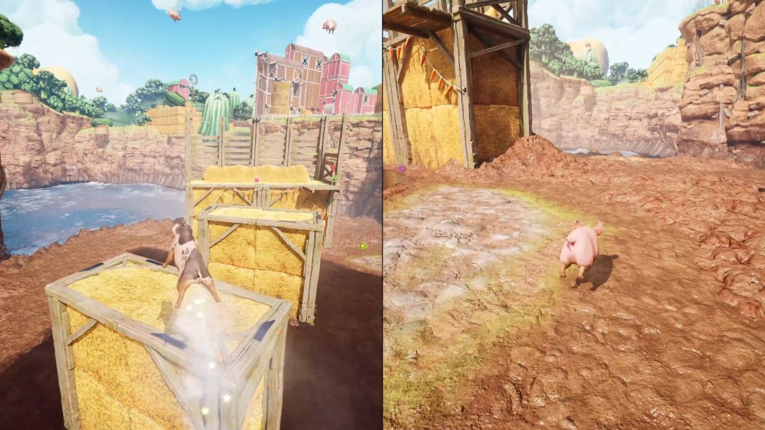 变身弹簧猪将队友弹飞到旁边高高草垛,拿到苹果