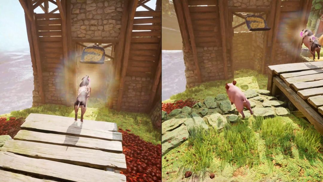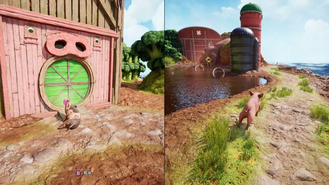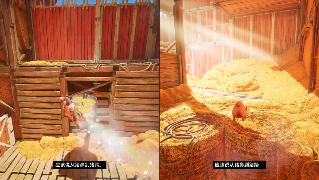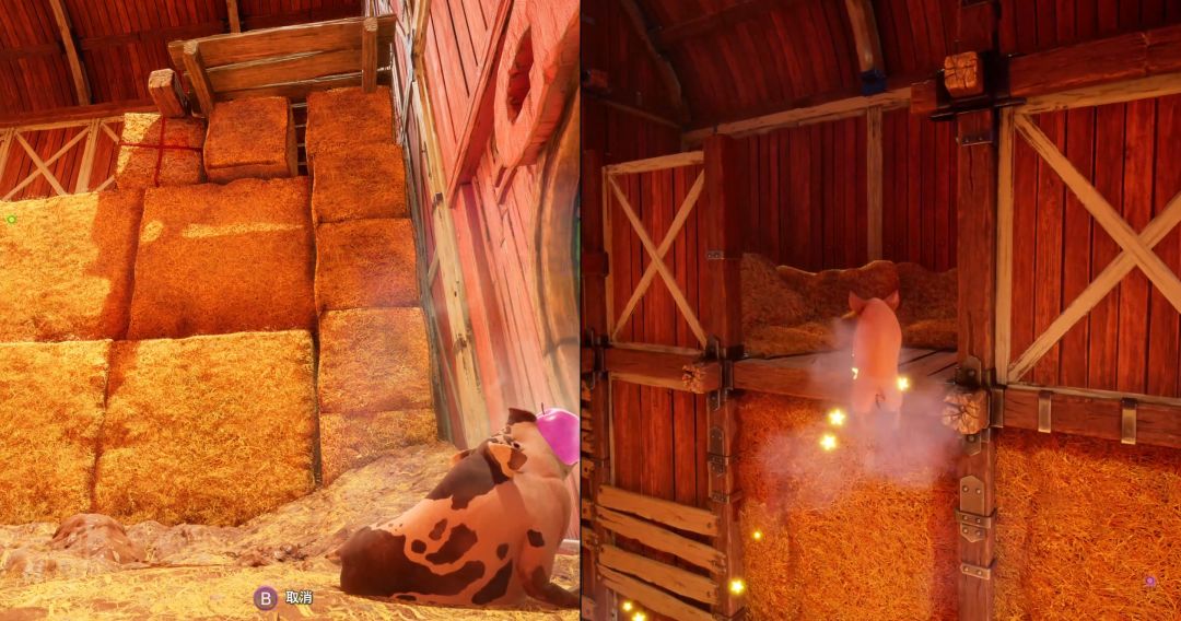 弹簧猪选择左边草垛、放屁猪选择右边操作,利用自身优势就可以跨越围栏