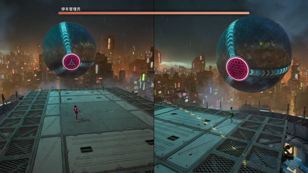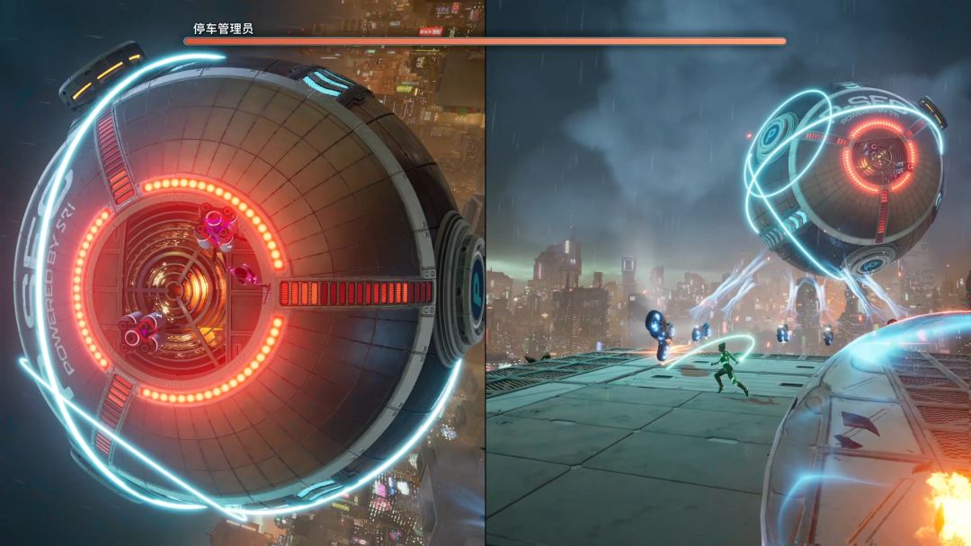 小粉负责击打红色光圈这里的物体、击落后小绿负责抓取并向球体攻击
