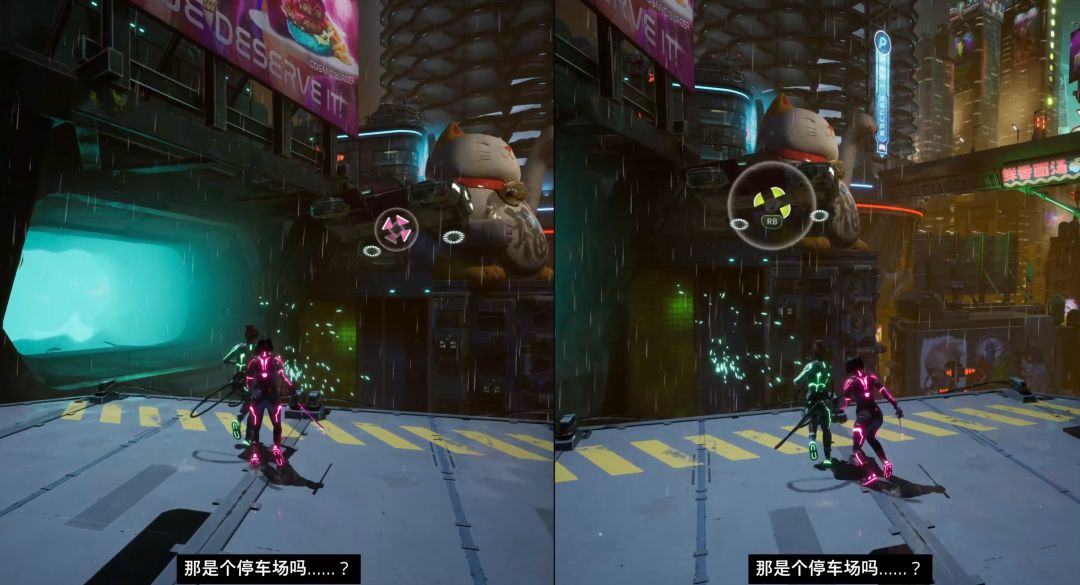 小粉负责击打装置、小绿前方会弹出抓取物品、双方各有俩处击打与抓取地方