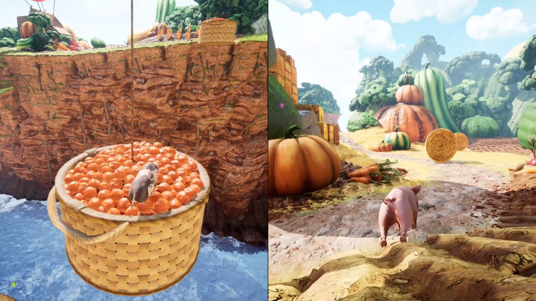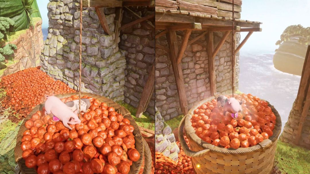 喷射猪释放彩虹屁跳到铁锹上,然后跳到旁边一筐是番茄的框里。