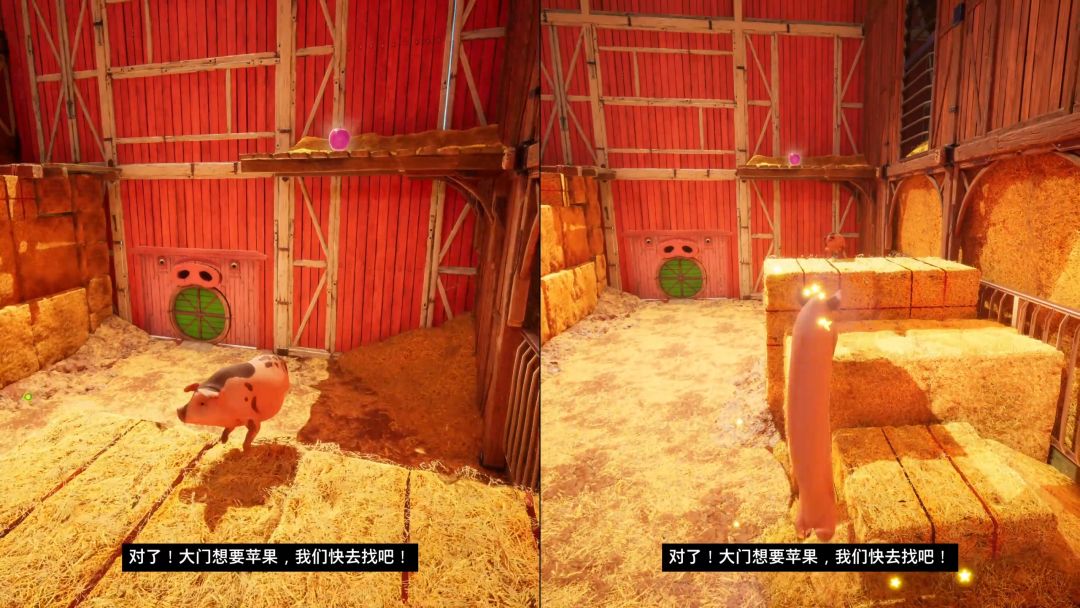 粉色苹果需要喷射猪从左侧草垛上去,再跳到对面苹果位置