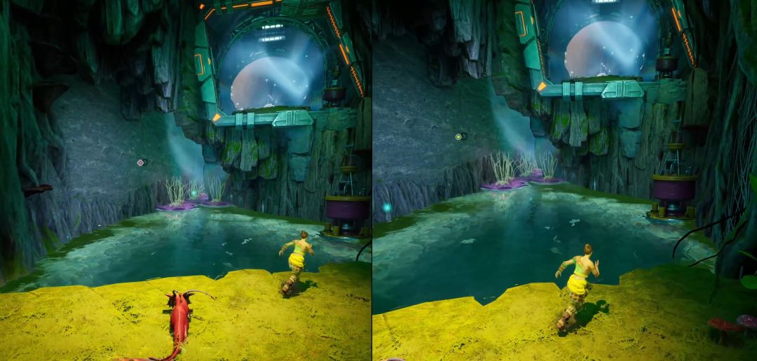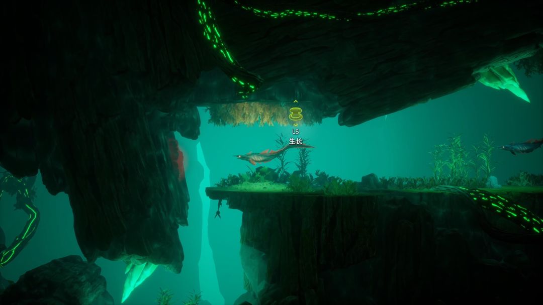 人形状态抓取对面棍子,小鱼快速从左边游过去,人形状态再次跳到小鱼拖动的藤条上