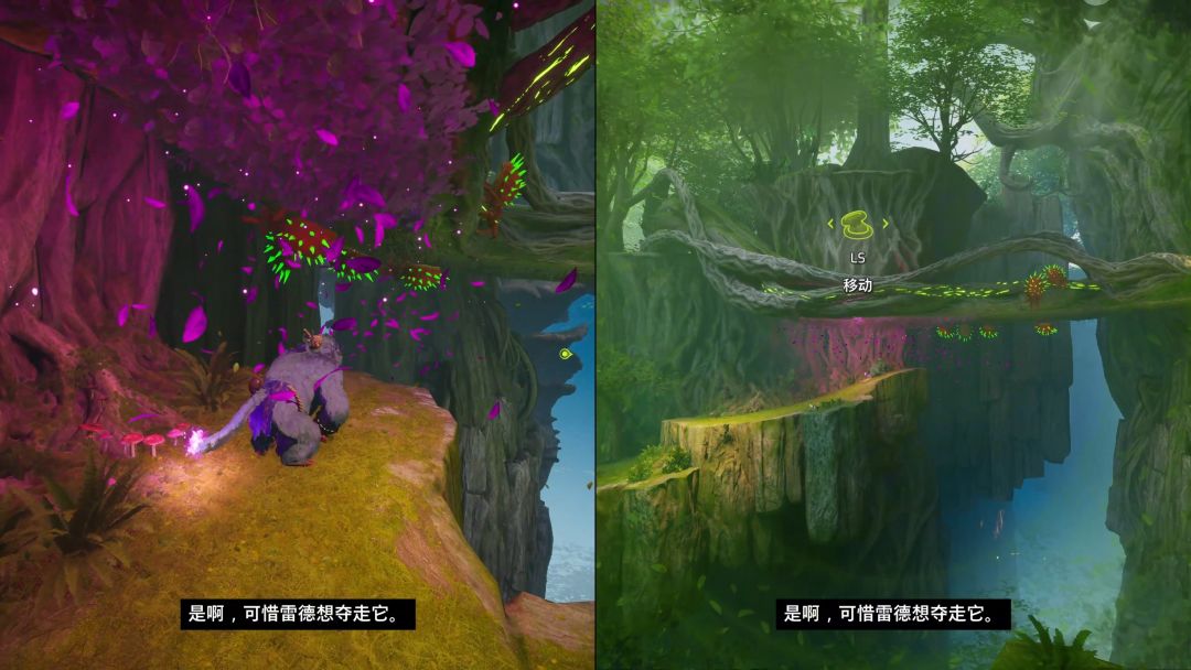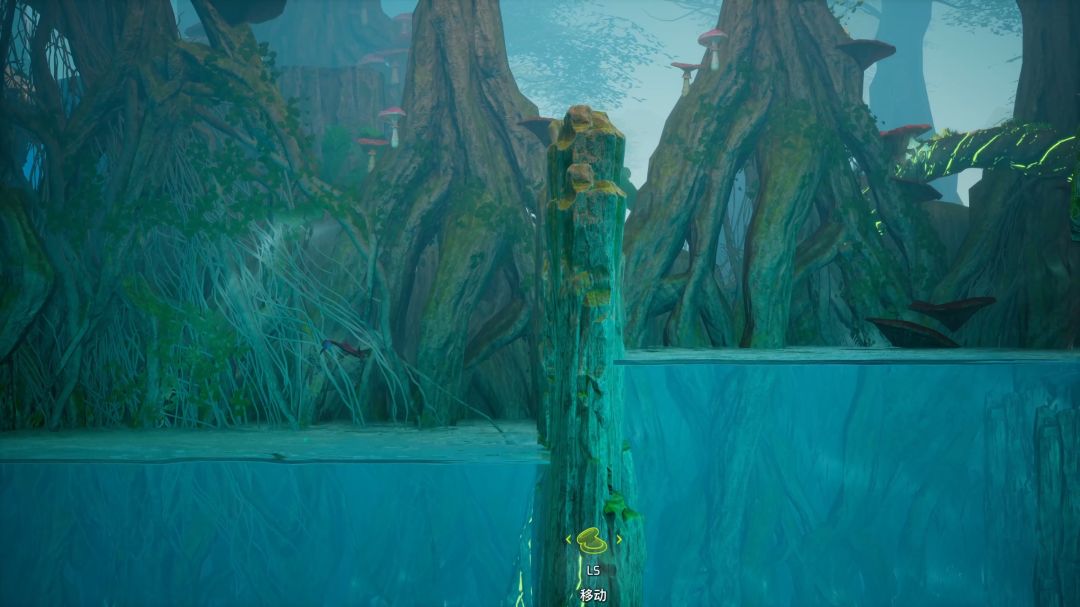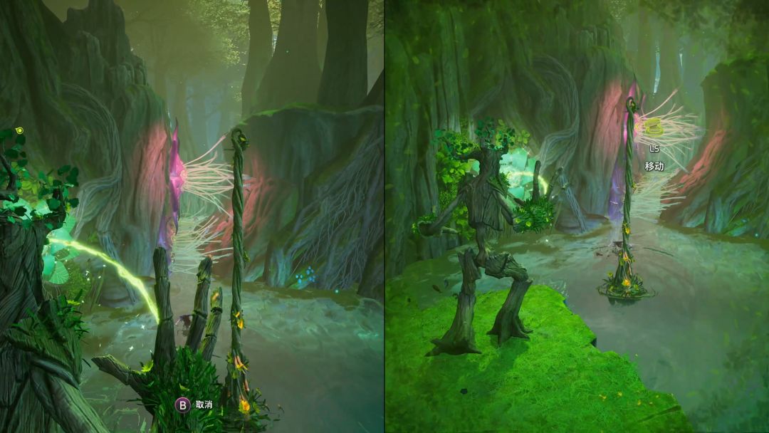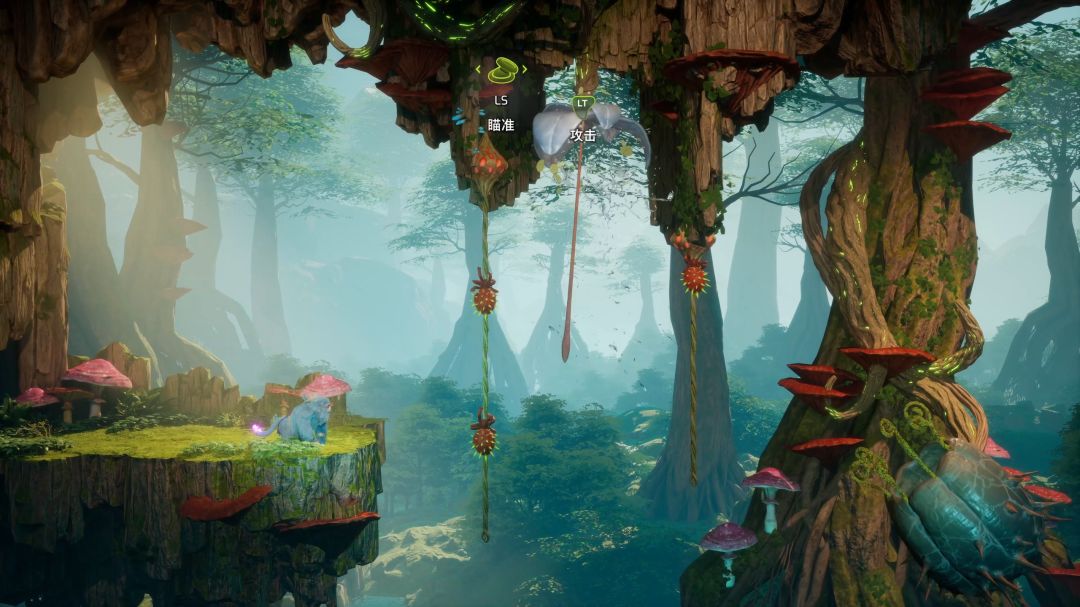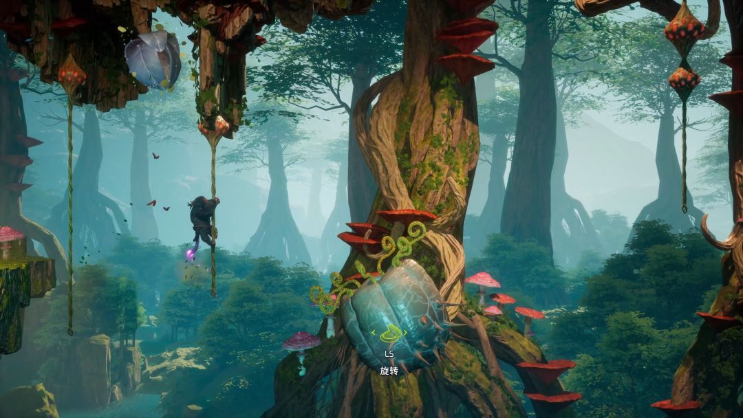 发光蘑菇上进行跳跃,随后抓住垂下来的树条进行跳跃