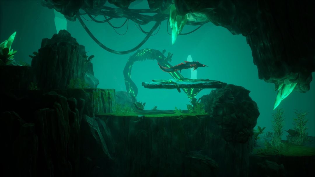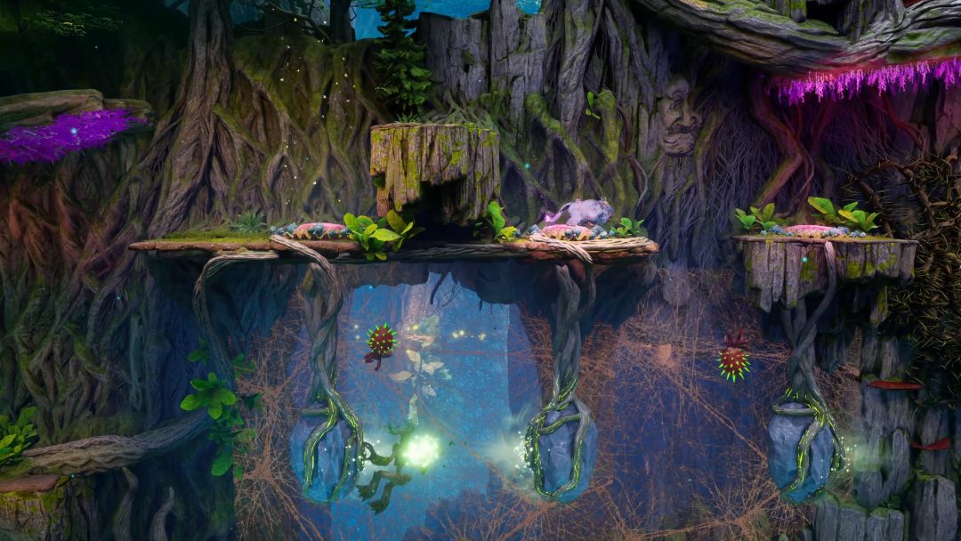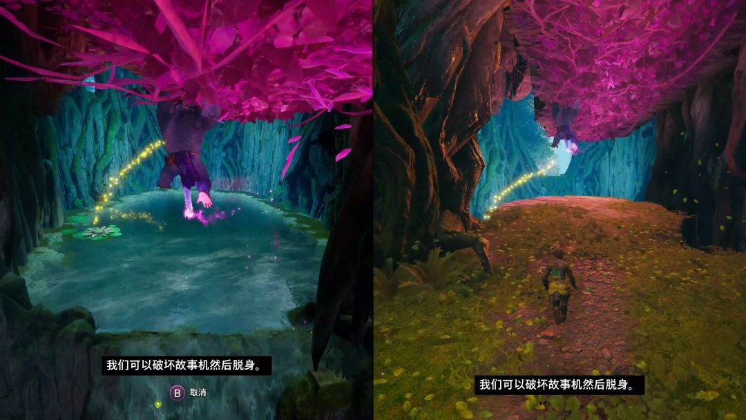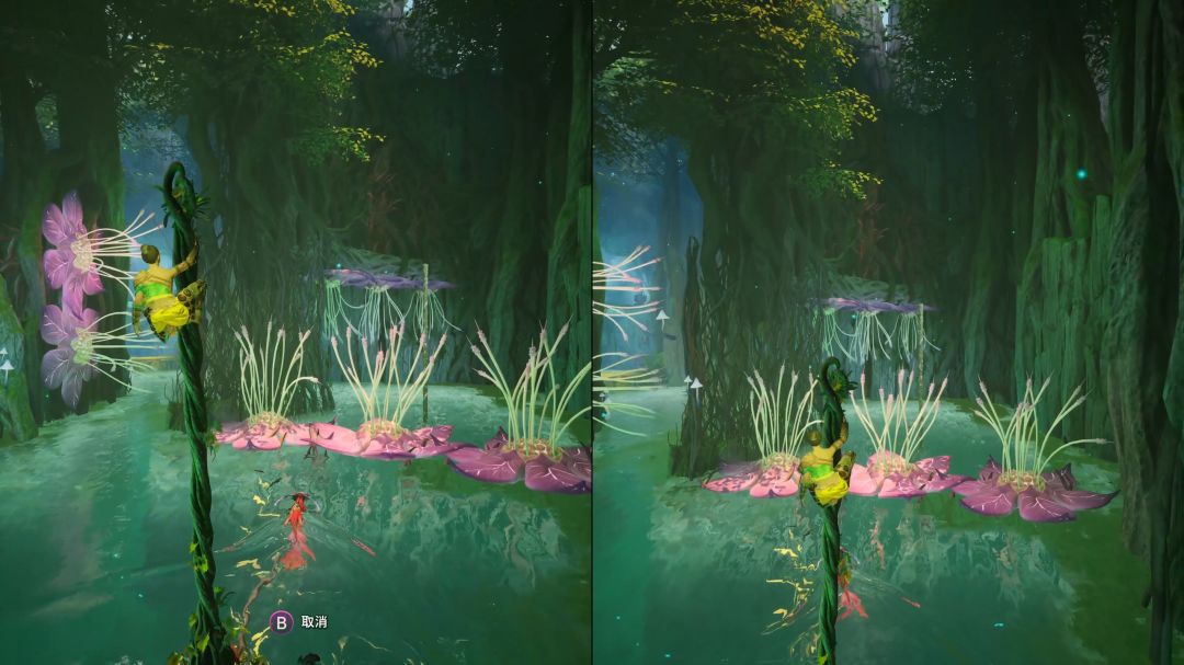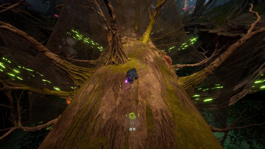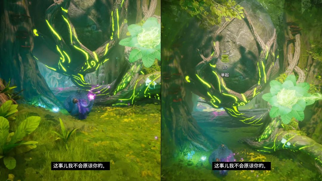 发光蘑菇上进行跳跃,随后抓住垂下来的树条进行跳跃