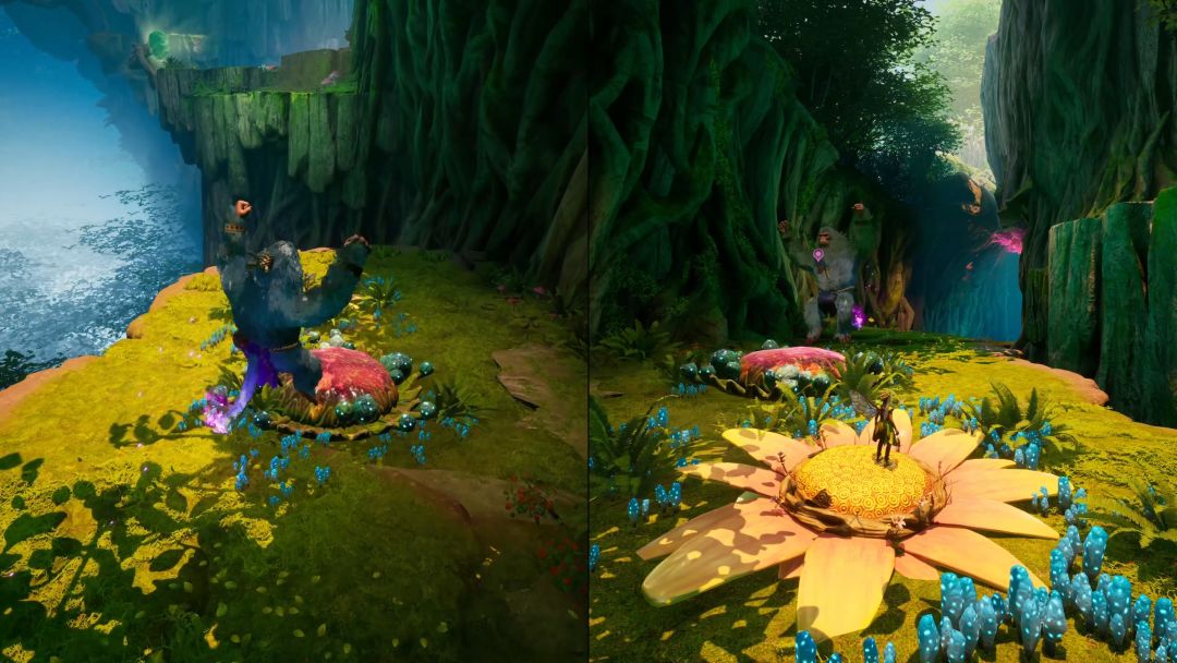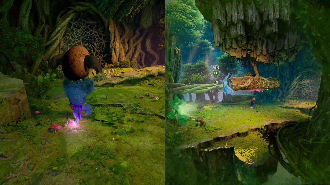 游戏中两人都可以变换各两种形态、变身猩猩可以跳起抓取头顶藤曼度过,另一个人可以变身小精灵,连续按A可以短时间保持空中飞行