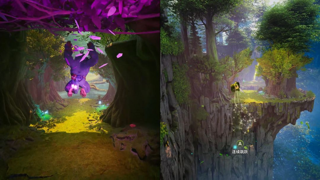 树人则是用花朵抓住树桩一直向左拉,随后猩猩在跷跷板上跳起,随后树人立刻松手