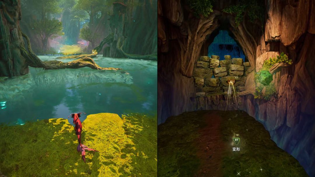 水下的时候可以变身时小鱼还是什么可以游动、另一个变身树人,对准绿色花苞进行操作