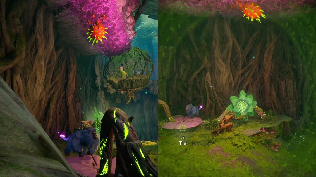猩猩负责捶打上面粉色的东西,会改变石块方向。树人记得抓取即可,期间双方要看好蜘蛛走向,记得躲避