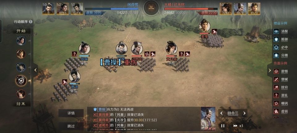 姜维战法:九伐中原+胜敌益强+奇正相生。韬略库:技艺善本+料敌善本+蜀武兴略(专属)。高级兵种:无当飞军点亮声东击西。此战摆出的是箕形阵,黄月英在前排,不过她的韬略库却让诸葛亮有更多机会嘲讽对手吸引火力。还有个小BUG,就是身处前排的黄月英不该携带受势善本,因为不起作用。至于后排的诸葛亮和姜维,在搭配方面都还是相当科学的。