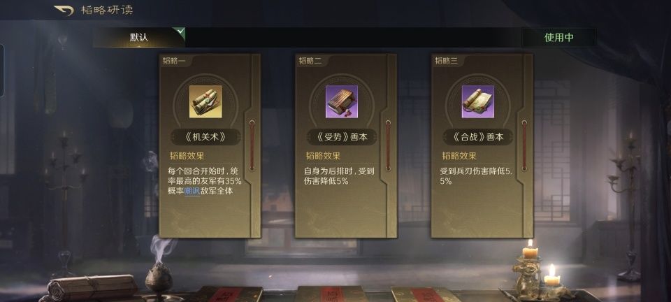 黄月英战法:木牛流马+折冲御侮+青囊急救。韬略库:机关术(专属)+受势善本+合战善本。
