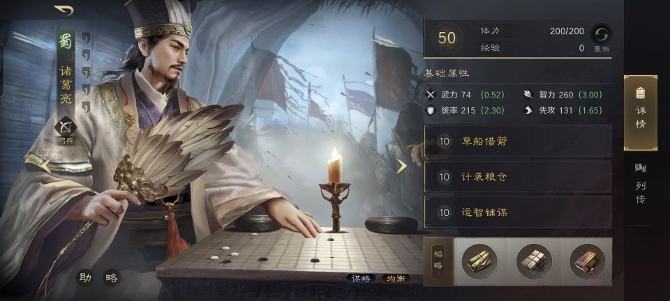 诸葛亮战法:草船借箭+计袭粮仓+运智辅谋。韬略库:出师表(专属)+威智善本+受势善本。