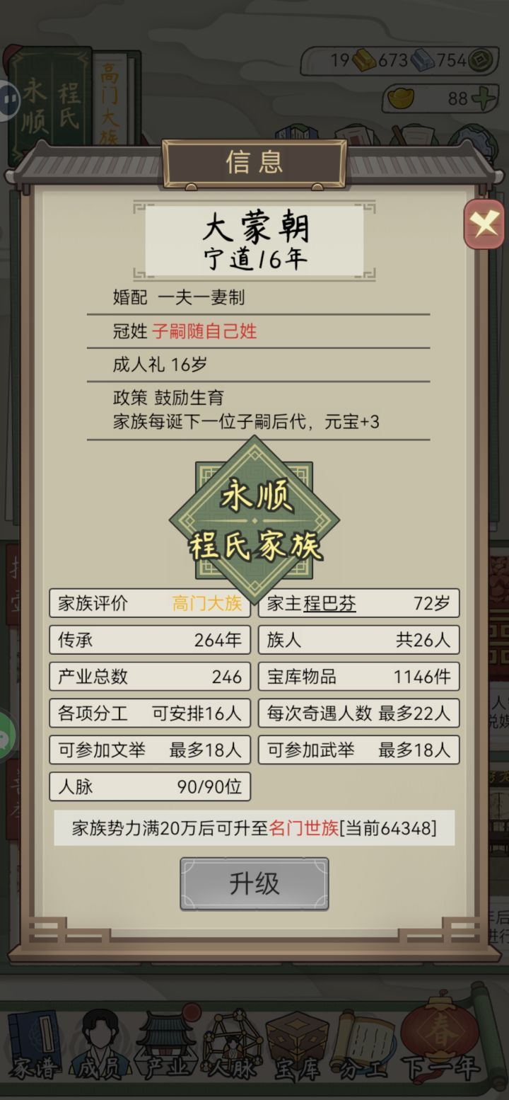 1.那提升势力的核心要素就是结婚生育大寿,我们整一个超级庞大的长寿家族稳扎稳打攒势力,这样人脉主选体魄,次选天资,确保族人寿命越来越长。