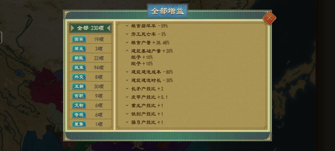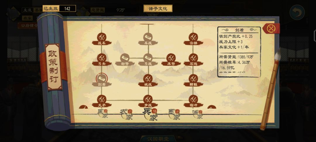 这些这些政策全点完后,如果你的王朝主流文化还是墨家的话因为共享所以还会再生效一次,也就是翻倍的效果。