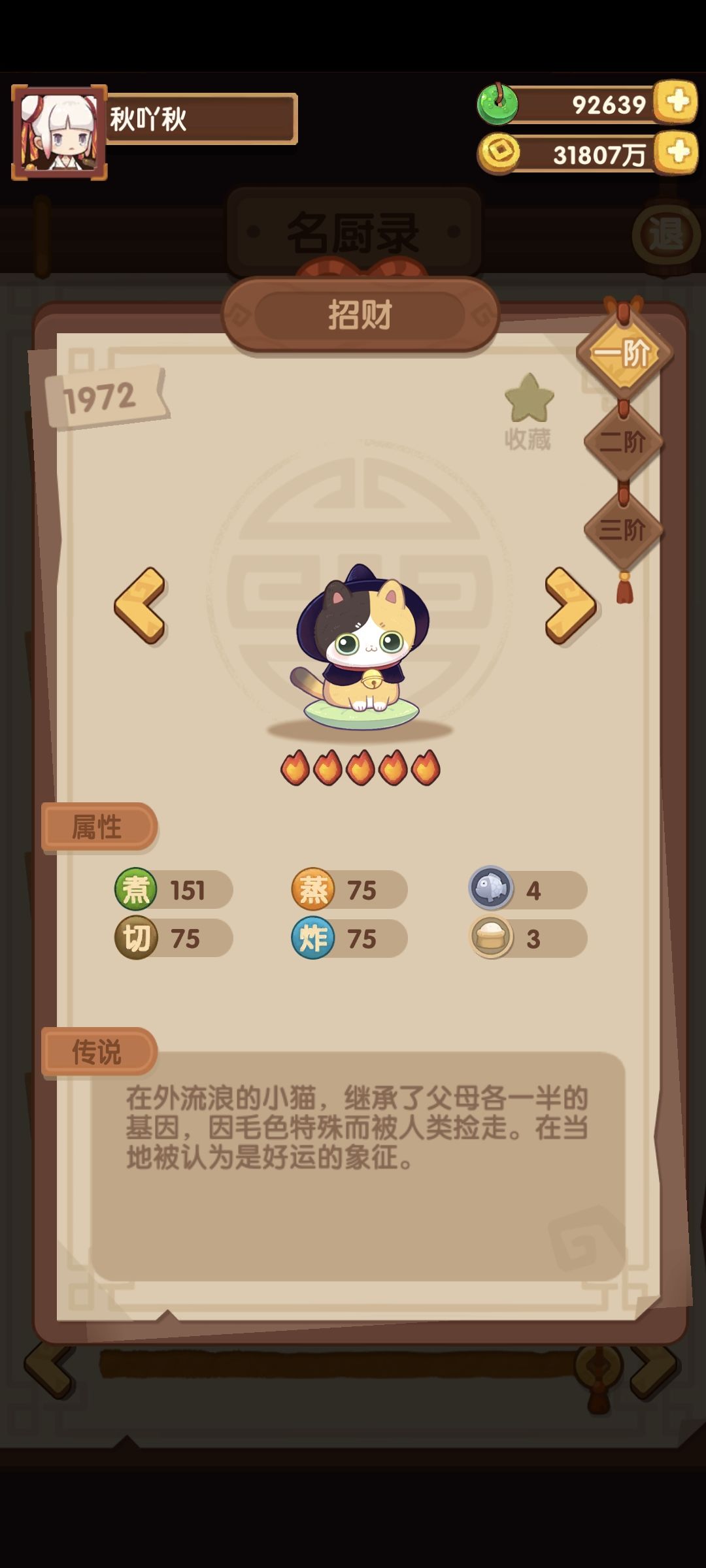 招财,三花猫。性格活泼好动,通人性,独立性强,是招财猫的原型,也是猫界女神。前面说布偶猫是喵界“小仙女”是指人类眼中受欢迎的猫猫,而三花猫是猫猫眼中备受欢迎的猫猫。由于基因问题,三花绝大多数是母猫,公猫概率极低,且三花公猫通常具有遗传缺陷,基本不具备生育能力。