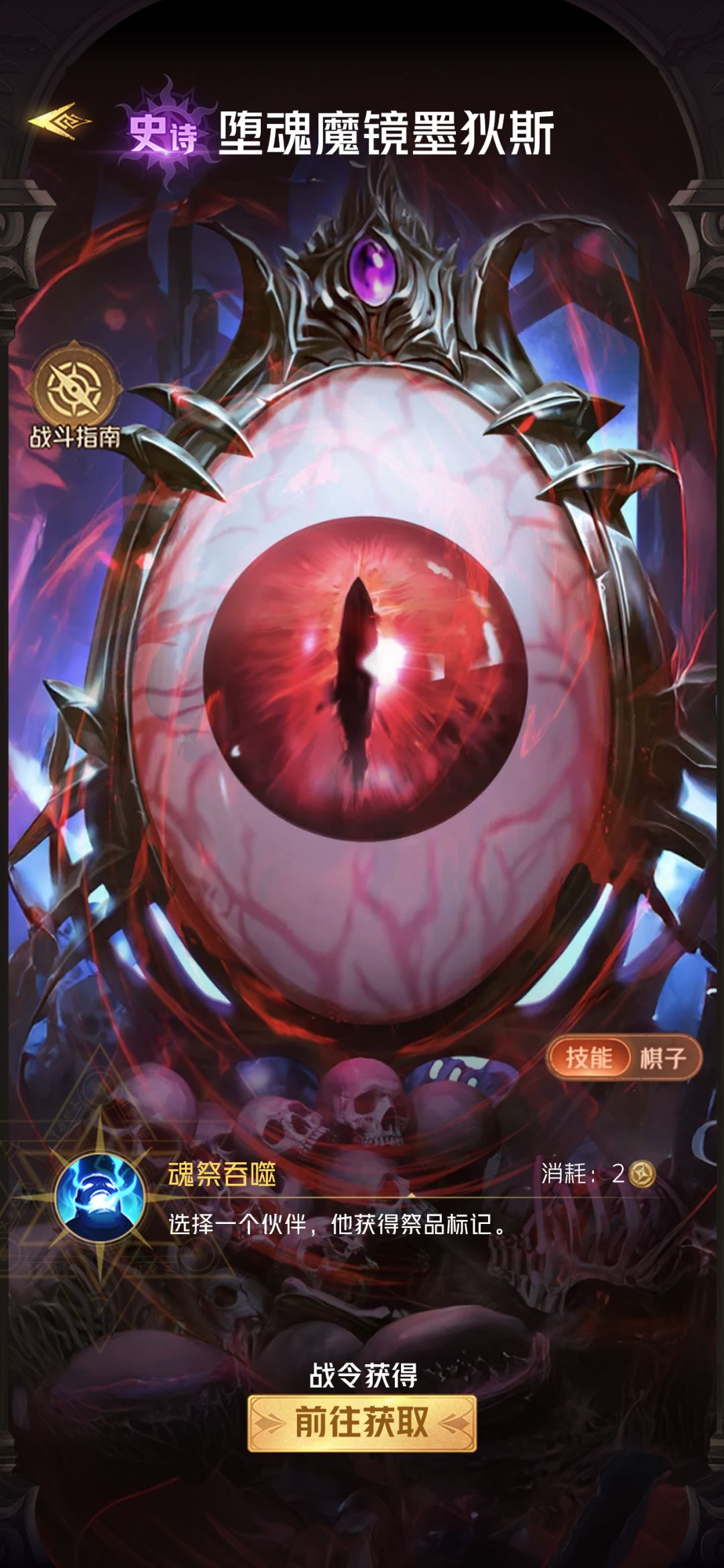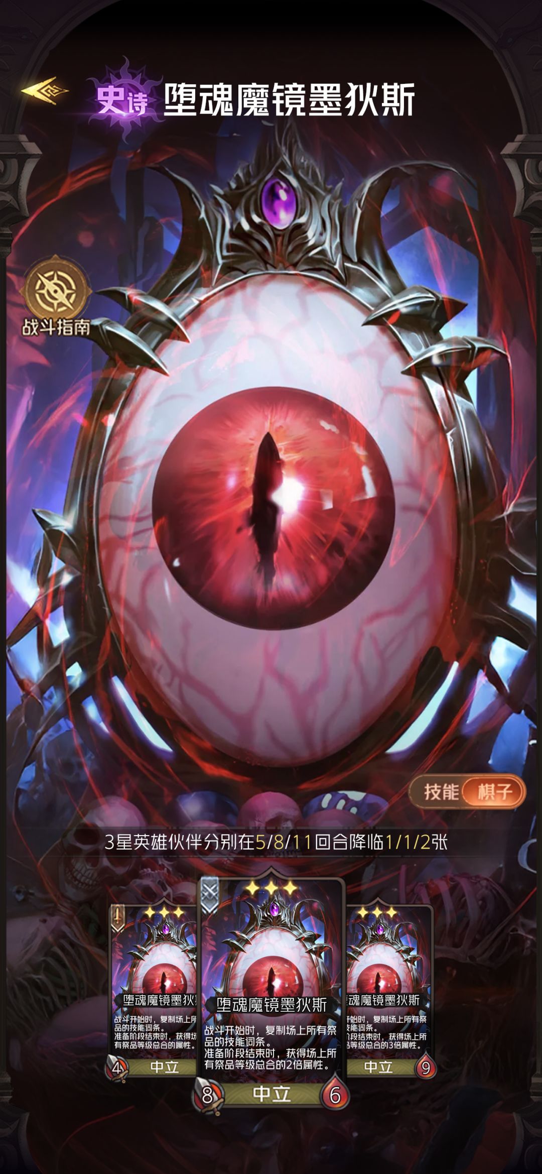 英雄棋子:【堕落魔镜墨狄斯】★★★,中立,2/2 , 战斗开始时,复制场上所有祭品的技能词条,准备阶段结束时,获得场上所有祭品等级总合的/2倍/3倍属性。