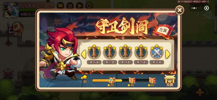 剑阁21-30:不到200级,平民玩法,月套姜维先手控制,月套冷却技能;诸葛主输出,基本一个技能秒一个;其他用陷阱,截止目前还比较顺利。
