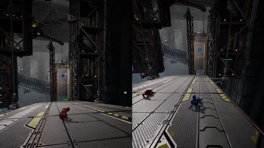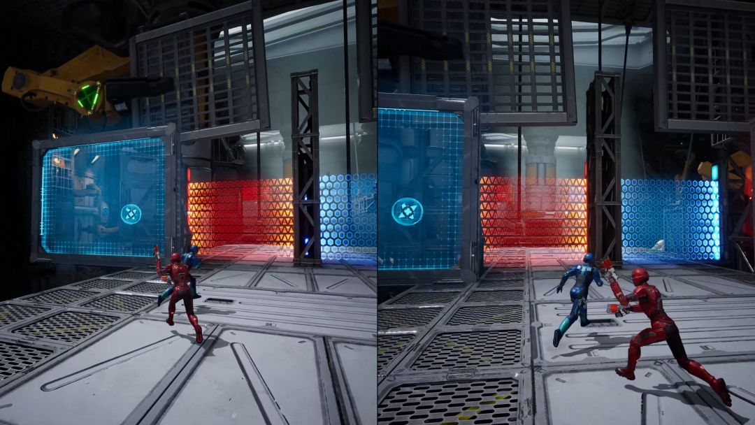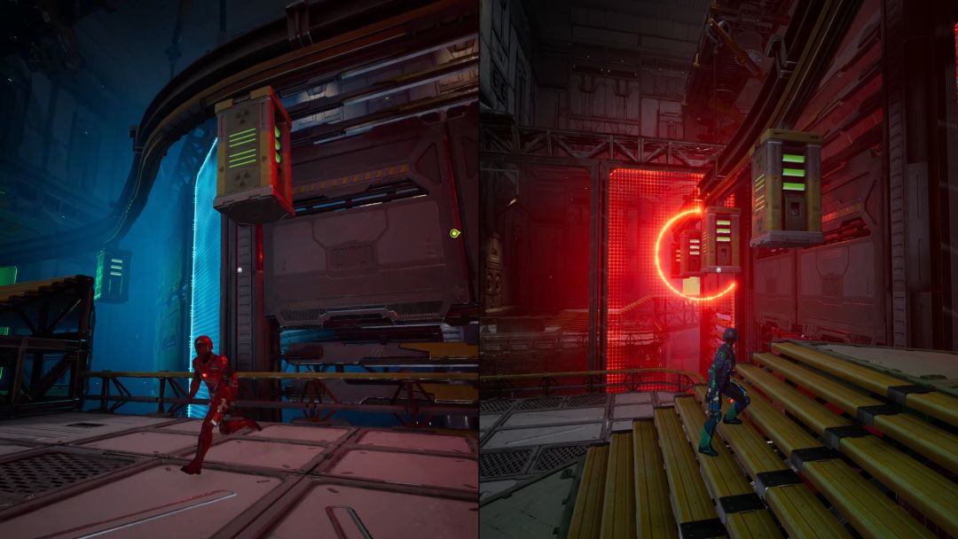 两人处于两个空间时,小蓝负责将爆破装置贴在传送箱子上,小红负责将红色光罩爆破打开,方便有装置的箱子进来