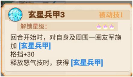 4、专属特殊BUFF:【玄星兵甲】,最多+20双抗,全体友军都可以享受。自身3格范围内敌军物攻强度-20。不仅自己更肉,友军也能享受到。