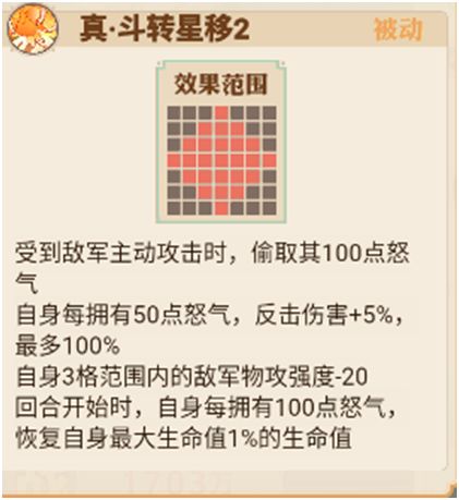 偷取怒气,增加反击伤害,减少对方物攻强度-20.最高回血20%,完美的肉盾被动技能。