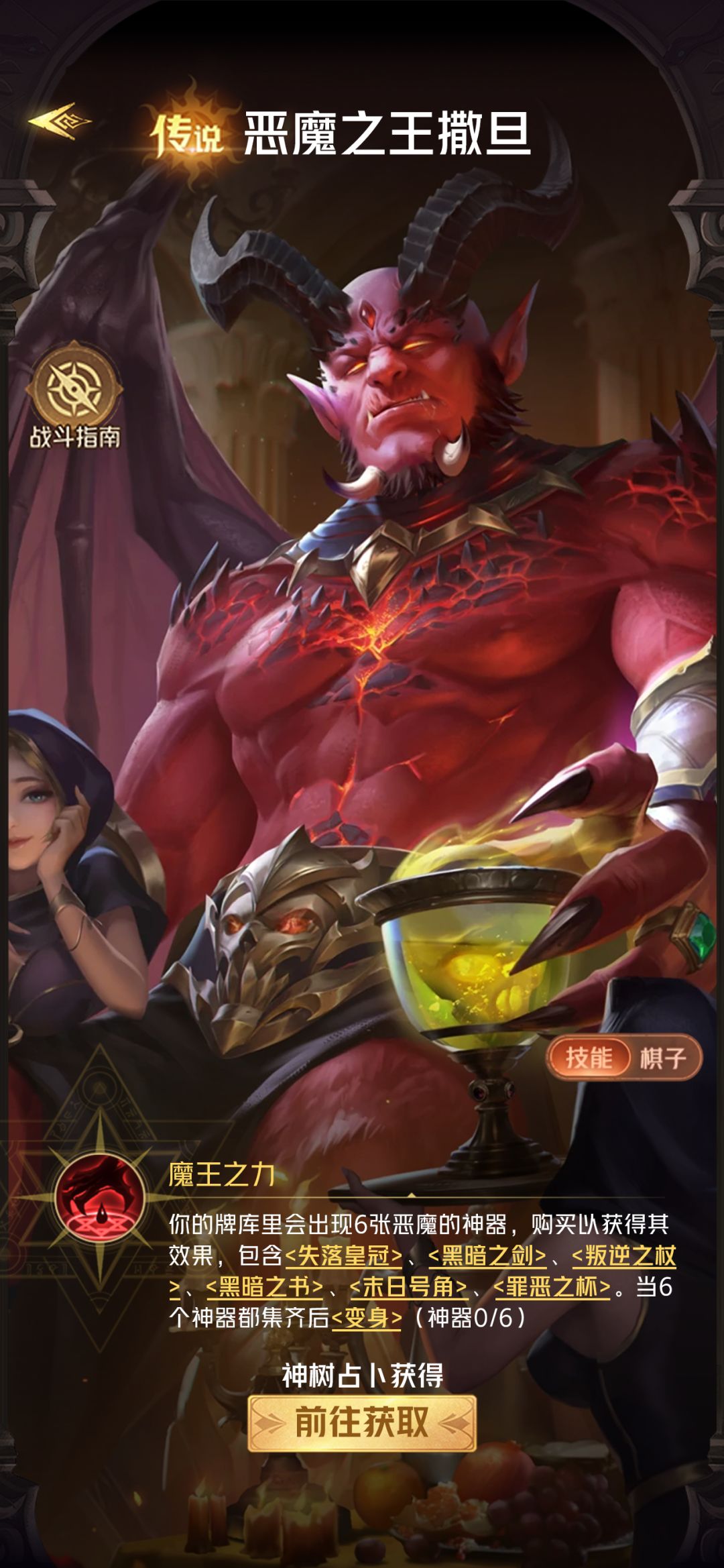 英雄技能:【魔王之力】:你的牌库里会出现6张恶魔的神器,购买以获得其效果,包含<失落皇冠>、 <黑暗之剑>、 <叛逆之杖>、 <黑暗之书>、 <末日号角>、 <罪恶之杯>。当6个神器都集齐后<变身>(神器0/6)