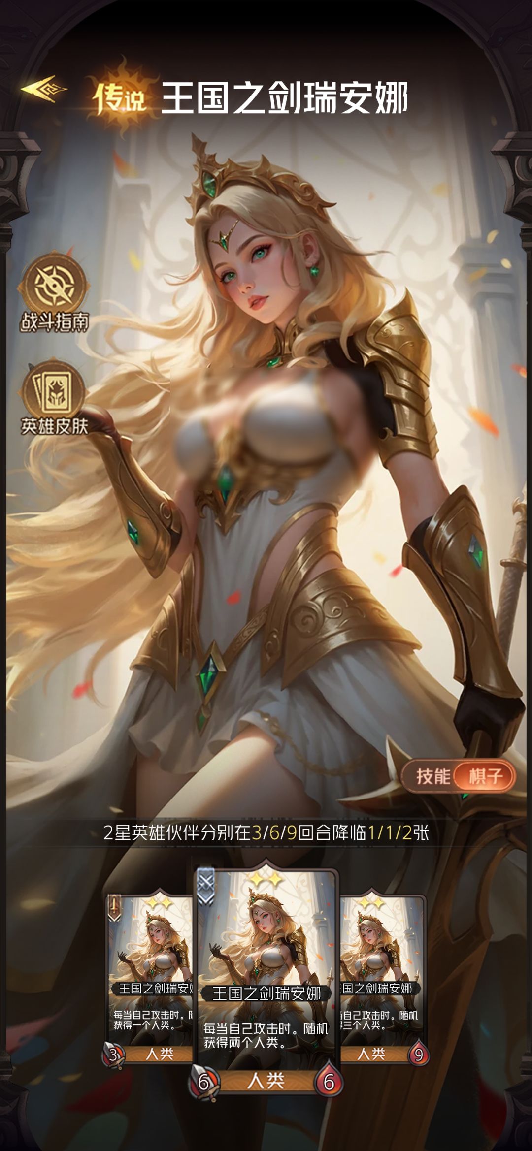 英雄棋子:【王国之剑瑞安娜】★★,人类,3/3 , 每当自己攻击时,随机获得1/2/3个人类。