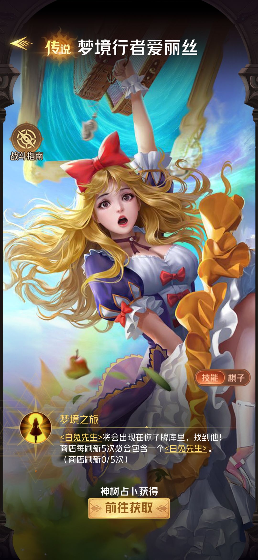 英雄技能:【梦境开启】:<白兔先生>将会出现在你了牌库里,找到他!(距离白兔先生出现,商店刷新0/5次)